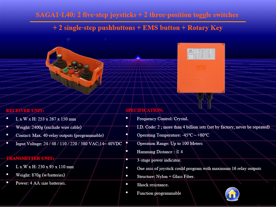 - รุ่นนี้สามารถที่ควบคุมเครนทั้ง 2 ตัวให้ทำงานพร้อมกัน เหมาะกับโครงสร้างเครนขนาดใหญ่ เพราะมี Relay ควบคุมการทำงานถึง40 เอาท์พุต การทำงานด้วย joystick จะมีสายคาดเอวและสายคล้องคอทำให้จับถนัดมือในการควบคุมรอกและเครน