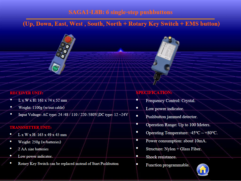 - เมื่อแบตเตอรี่อ่อนจะมีไฟโชว์ วัสดุเป็น Fiber Glass จึงทำให้ทนทานต่อแรงกระแทกได้ดีโดยหากเสริมการใช้ด้วยซองแข็งชนิดพิเศษซึ่งเป็น optเสริมก็ยิ่งเพิ่มความทนทานที่มากขึ้น การส่งคลื่นเป็นVHF จึงไม่รบกวนการทำงานของเครื่องจักร ปุ่มควบคุมการทำงานได้ทั้งฟังก์ชั่น หน่วงเวลา หรือ การตังค่าการเปิดไฟแสงจันทร์หรือพัดลมในการปฏิบัติงานเหมาะกับ monorail crane ที่ไม่ต้องการความซับซ้อน